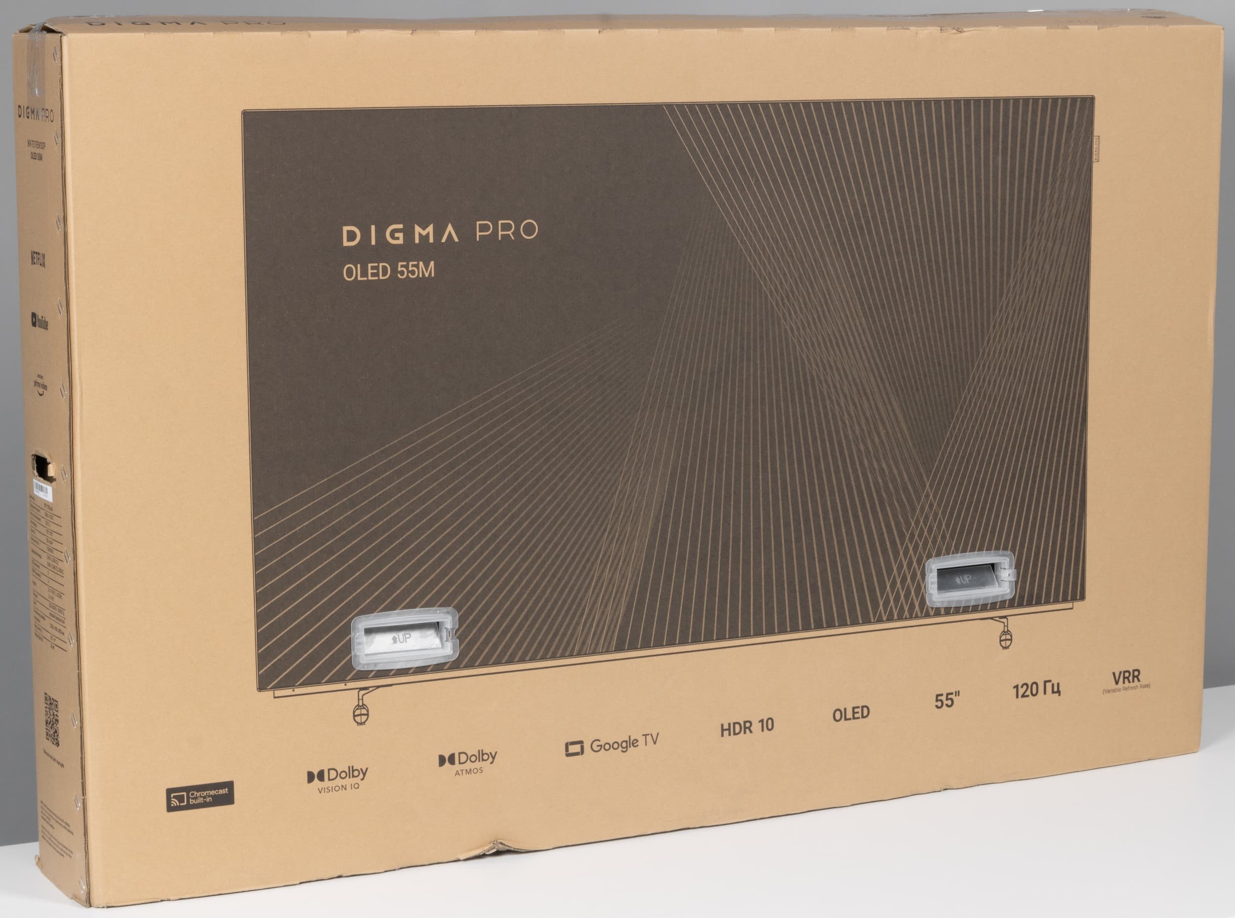 Попавший к нам Digma Pro OLED 55M — это 55-дюймовый OLED-телевизор на базе матрицы с органическими светодиодами, с визуально безрамочным дизайном, разрешением 4К и работающий под управлением операционной системы Google TV на базе Android 11. Важными отличительными чертами новинки являются частота обновления 120 Гц, продвинутая встроенная акустическая система формата 2.1.2 и поддержка умной и непрерывной подстройки изображения Dolby Vision IQ. Телевизор представлен в новой линейке бренда и занимает высшую позицию в ассортименте Digma Pro вместе с аналогичной 65-дюймовой моделью.