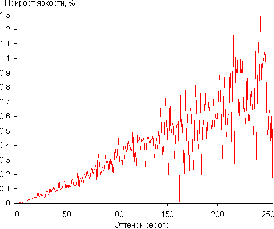 Для оценки характера роста яркости на шкале серого мы измерили яркость 256 оттенков серого (от 0, 0, 0 до 255, 255, 255) при Яркость = 44 и Контраст = 46. График ниже показывает прирост (не абсолютное значение!) яркости между соседними полутонами: