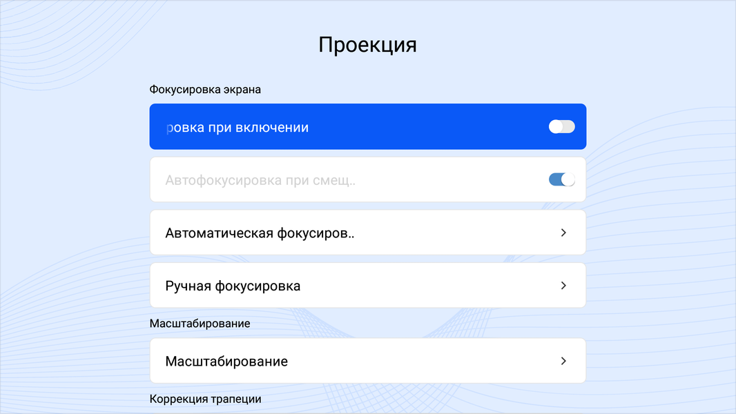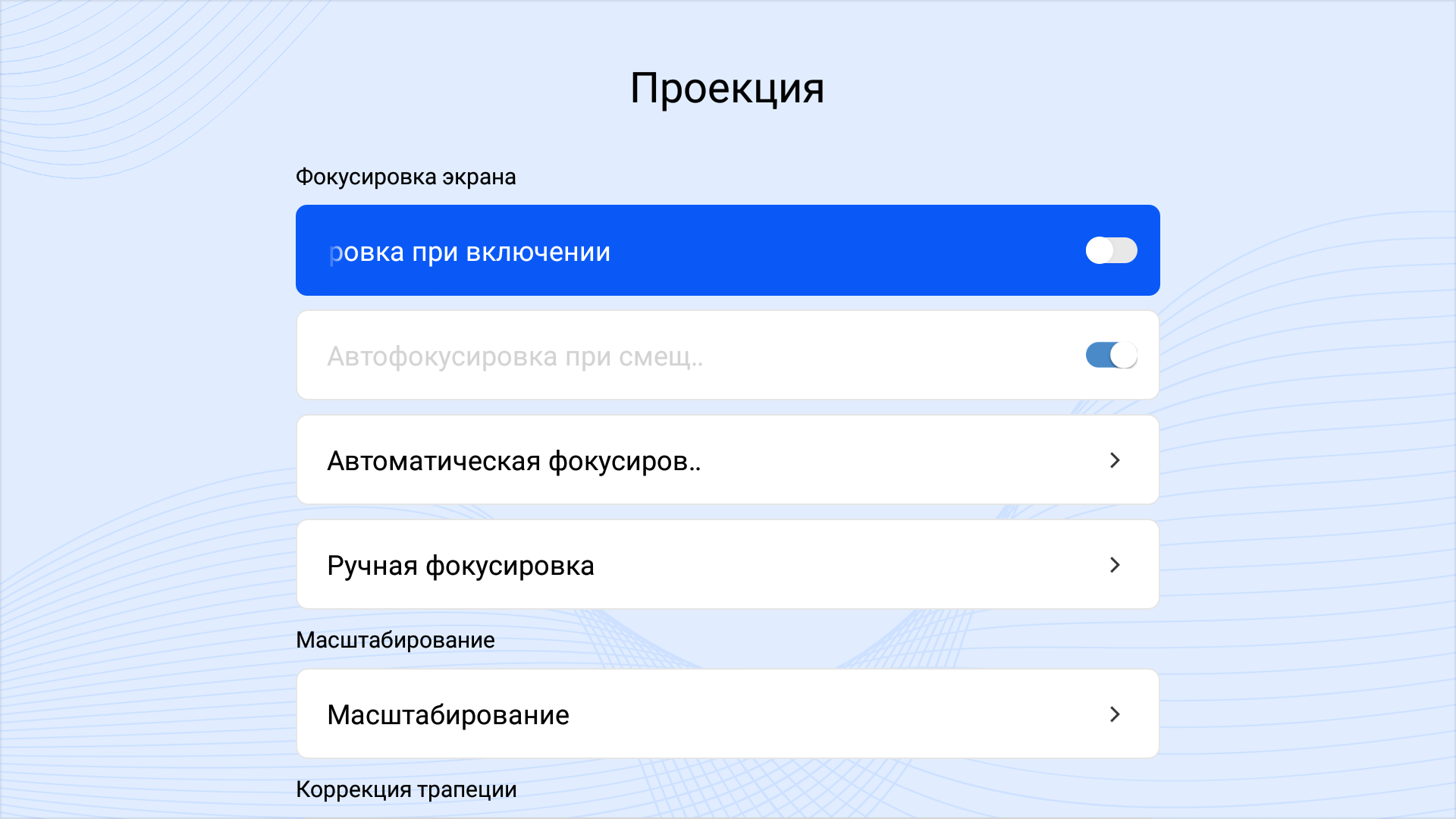 Меню с настройками проектора можно вызвать с домашней страницы или нажав на кнопку с шестеренкой на пульте ДУ. Настроек совсем немного.