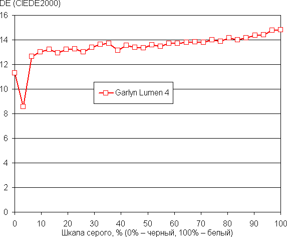 Графики ниже показывают цветовую температуру на различных участках шкалы серого и отклонение от спектра абсолютно черного тела (параметр ΔE):