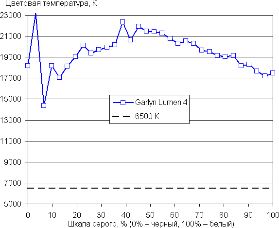 Близкий к черному диапазон можно не учитывать, так как в нем цветопередача не так важна, а погрешность измерения цветовых характеристик высокая. Цветовой баланс средний, так как цветовая температура значительно выше стандартных 6500 К и ΔE выше 10 единиц, при этом цветовая температура существенно изменяется от оттенка к оттенку на значимой части шкалы серого, что отрицательно сказывается на визуальной оценке цветового баланса.