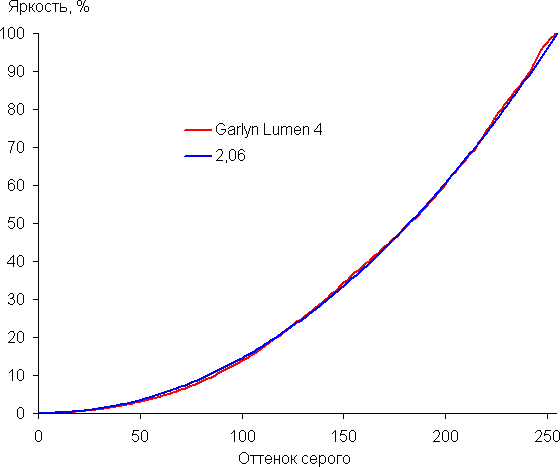 Аппроксимация полученной гамма-кривой дала значение показателя 2,06, что ниже стандартного значения 2,2, поэтому картинка чуть высветлена. Реальная гамма-кривая немного отклоняется от аппроксимирующей функции: