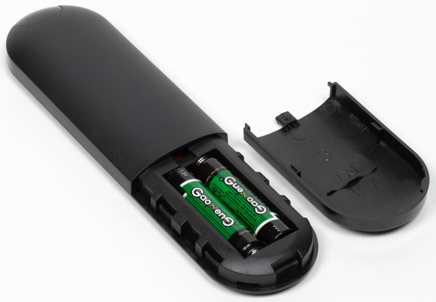 В комплект поставки входят очень краткое и более подробное руководства пользователя на русском языке, приветственная карточка, кабель HDMI, сетевой кабель питания, упомянутая ножка, небольшой пульт ДУ и два элемента питания к нему.