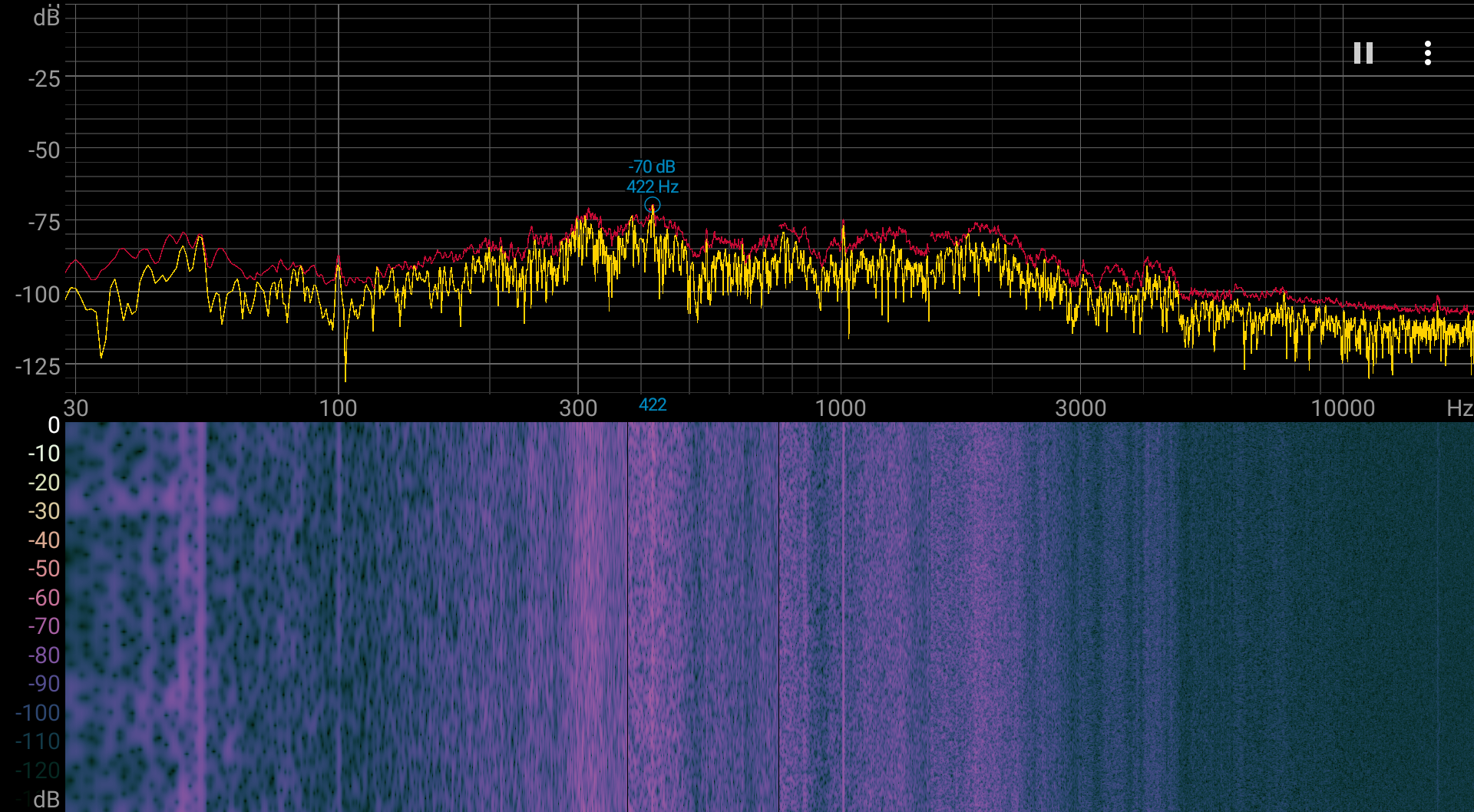 Шум от системы охлаждения довольно высокий. Хорошо хоть, что характер звука ровный и особого дискомфорта не доставляет, через какое-то время на шум внимания уже почти не обращаешь. Спектрограмма шума от системы охлаждения весьма ровная, пиков с высокой интенсивностью нет.