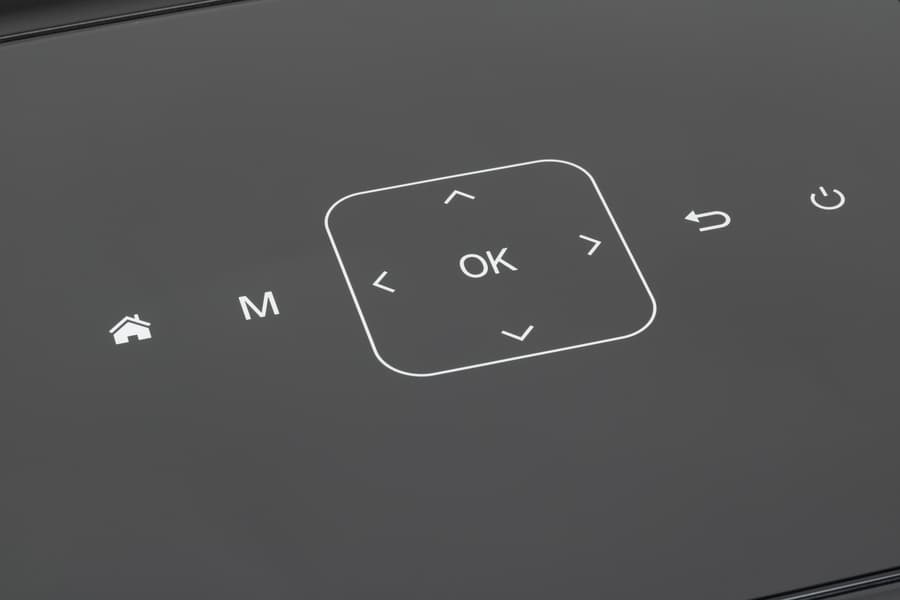 Белые значки на верхней панели обозначают места расположения сенсорных кнопок. Кнопка питания в режиме ожидания подсвечивается красным, а при работе проектора все кнопки подсвечиваются белым цветом.