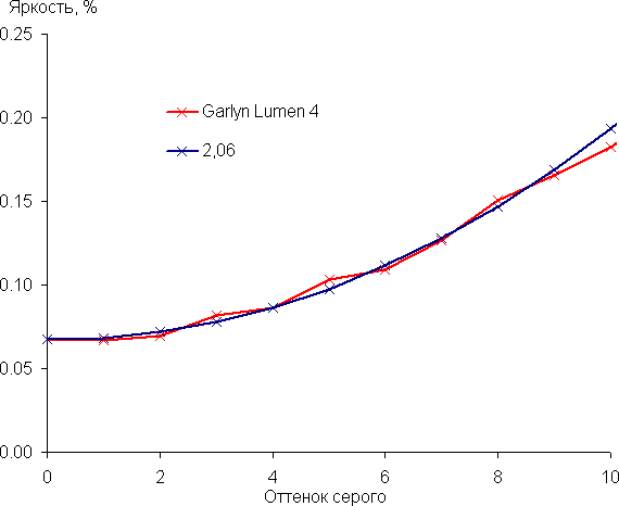 Из графика следует, что рост прироста яркости на большей части шкалы серого более-менее равномерный, и почти каждый следующий оттенок значимо ярче предыдущего. Самый светлый оттенок по яркости не отличим от белого, а в темной области самый темный оттенок сливается с черным, но это на качество отображения оттенков в тенях и в светах практически не влияет: