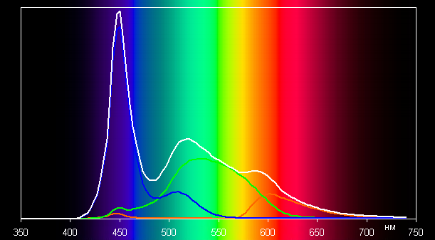 Поэтому цвета выглядят бледноватыми. Ниже приведен спектр для белого поля (белая линия), наложенный на спектры красного, зеленого и синего полей (линии соответствующих цветов):
