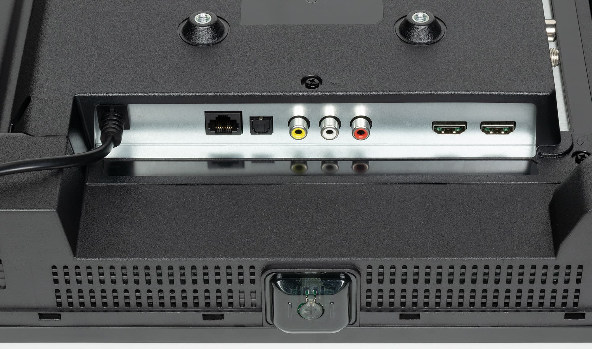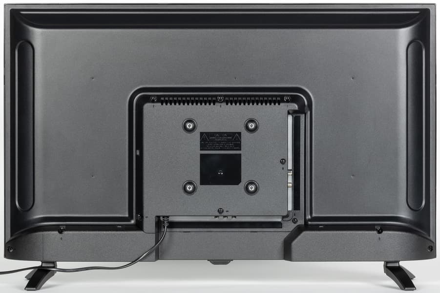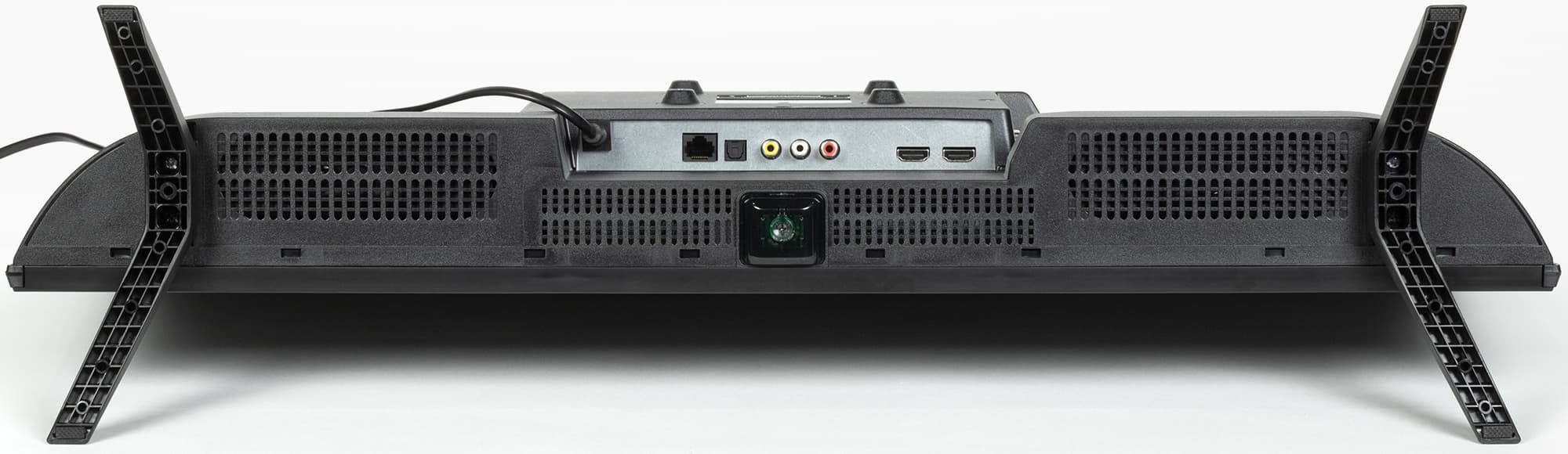 Задняя панель условно в верхней части изготовлена из тонкого листа стали и имеет стойкое черное матовое покрытие. Выступающий назад кожух в центральной-нижней части с заходом на нижний торец изготовлен из черного пластика с матовой поверхностью. Интерфейсные разъемы размещены в двух незамкнутых нишах. Часть разъемов направлена вниз, часть вбок. Подключать кабели к даже разъемам, направленным вбок, включая разъем для подключения наушников, неудобно, так как приходится далеко тянуться. В верхней части, где уже нет пластикового кожуха, телевизор все равно тонким не выглядит.