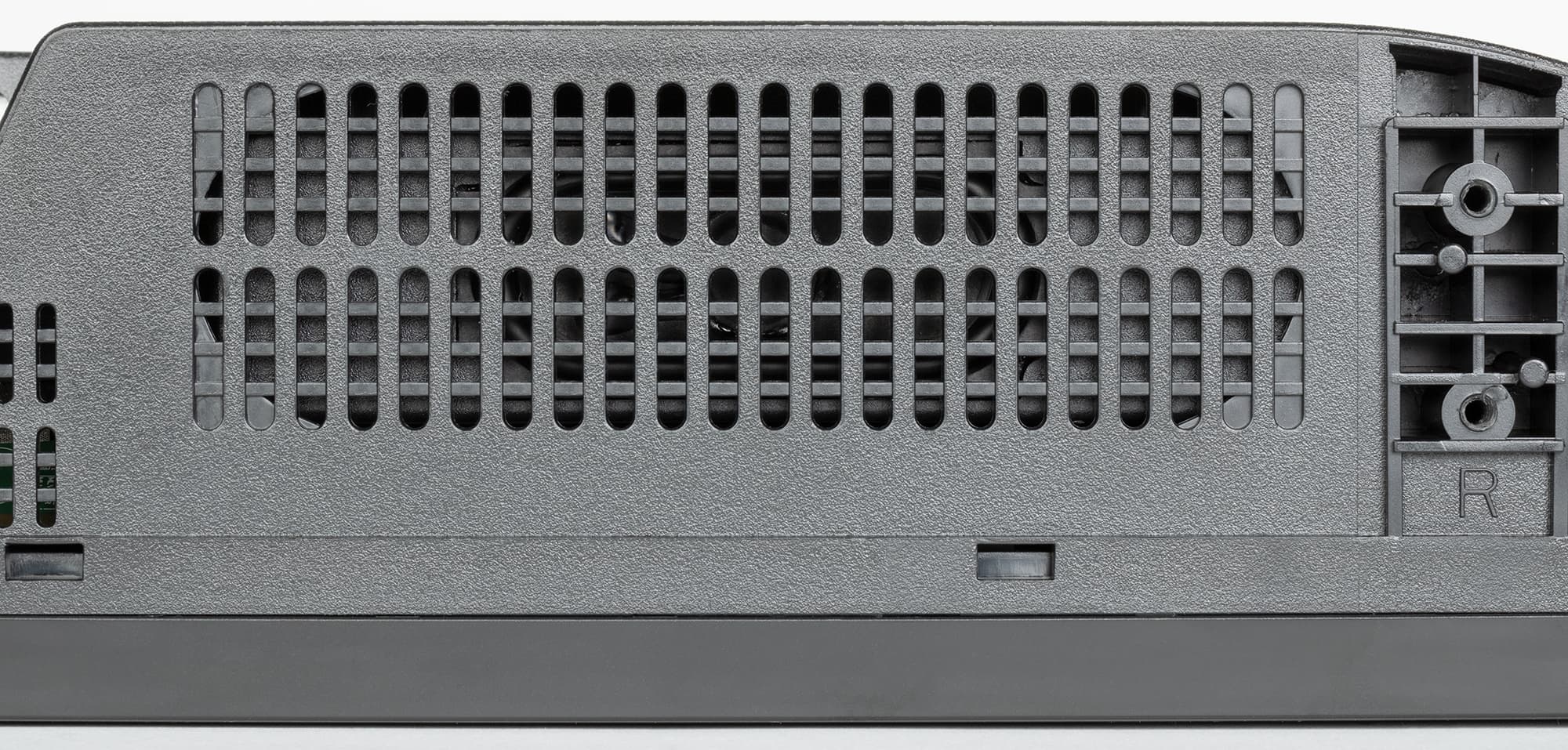 На пластиковом кожухе сверху и снизу есть вентиляционные решетки. За двумя решетками на нижнем торце можно разглядеть по одному средне-высокочастотному громкоговорителю с вытянутым диффузором.