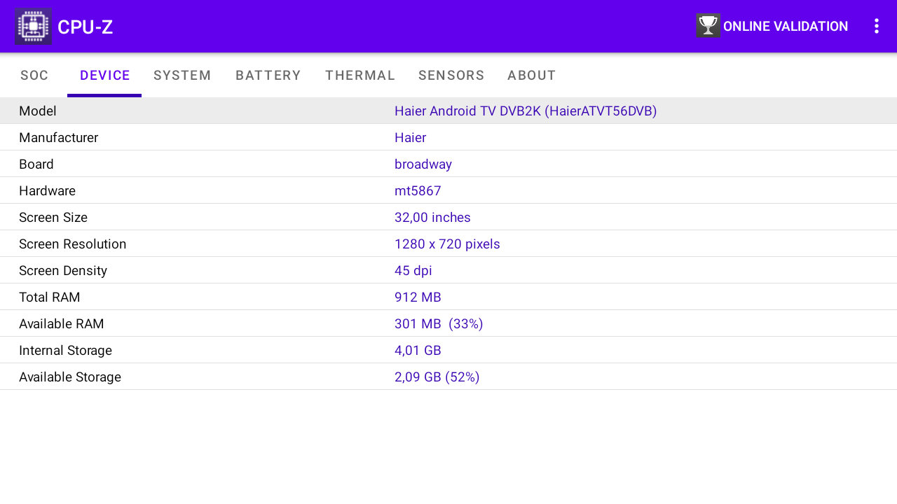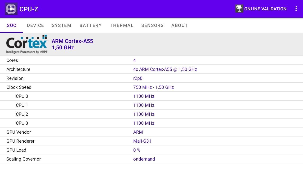 Программной платформой для этого ТВ служит операционная система Android TV, основанная на Android версии 11. Конфигурацию аппаратной части поясняют данные программы CPU-Z: