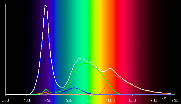 Такой спектр с относительно узким пиком синего и с широкими горбами зеленого и красного цветов характерен для ЖК-матриц, в которых используется белая светодиодная подсветка с синим излучателем и желтым люминофором.