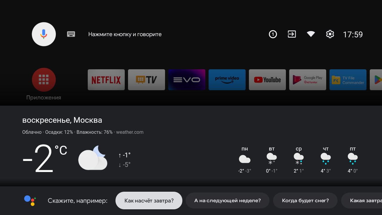 В ряде программ работает голосовой ввод текста. Также есть базовая интеграция с самим ТВ, например, голосом можно менять громкость, выключать/включать звук, открывать меню с настройками, выбирать нужный вход и запускать программу по ее названию. Еще можно вывести на экран программу телепередач и переключиться на ТВ-канал по его названию. На слова и фразы, не распознанные как команды, выполняется поиск, и в результатах поиска будет предложен развлекательный контент, в том числе из YouTube, а иногда открывается страница приложения в магазине Google Play с названием, соответствующим поисковой фразе.