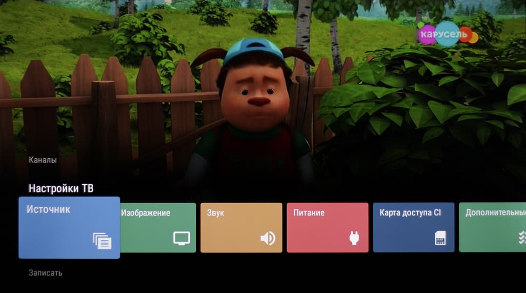 Доступ к настройкам также удобно получить из контекстного меню с плитками, которое можно вывести на экран при просмотре ТВ-каналов или внешних источников видеосигнала.