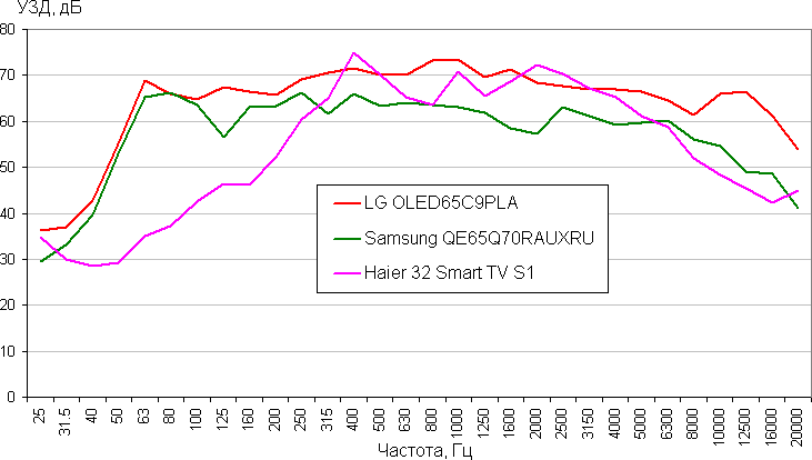 Громкость встроенной акустической системы для жилой комнаты, соответствующей по размерам данной диагонали экрана, достаточная. Стереофонический эффект выражен. Присутствуют высокие и средние частоты, низких — совсем немного. Явно есть паразитные резонансы корпуса, но даже на максимальной громкости нет значительных искажений сигналов с высоким уровнем. В целом для класса встроенной в телевизор акустики ее качество приемлемое. Сравним АЧХ этого ТВ с АЧХ двух телевизоров высшего класса (получена с помощью шумомера при воспроизведении звукового файла с розовым шумом, интервал УЗД в 1/3 октавах):