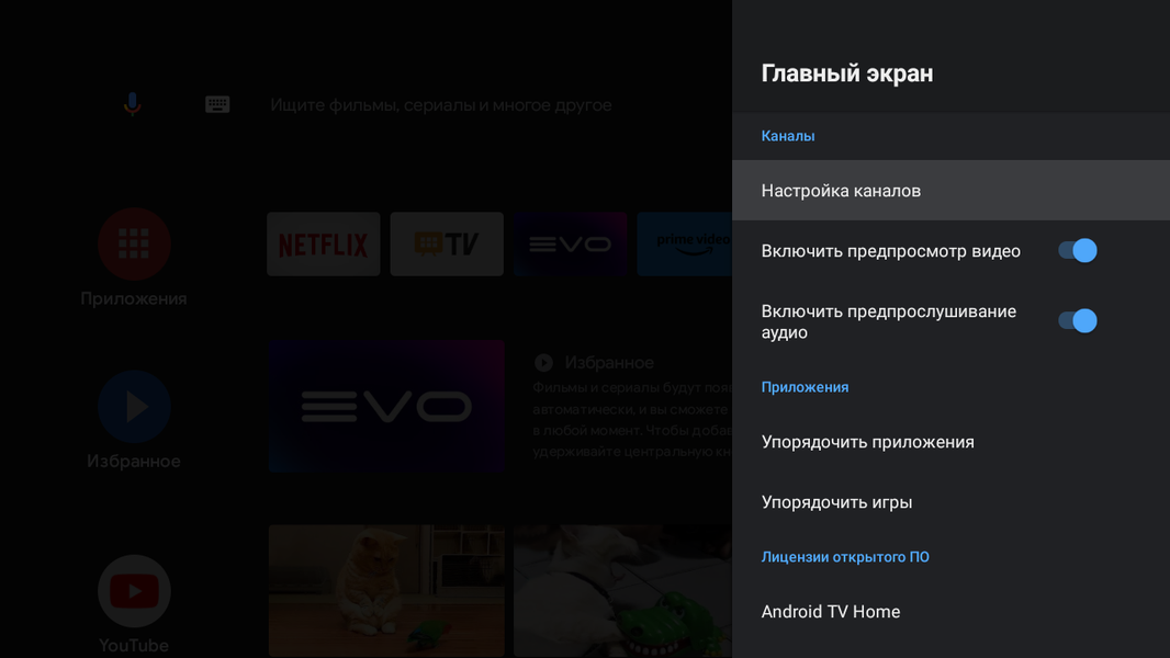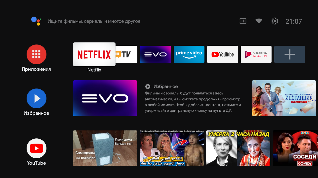 Домашняя страница (или Главный экран) в Android TV представляет собой несколько горизонтальных лент с плитками избранных установленных приложений и рекомендуемого контента. Кружки с подписями слева поясняют, к чему относятся содержимое лент, и позволяют запустить соответствующую программу или выводят список установленных программ — кружок Приложения (кроме кружка Избранное). В верхней части страницы есть значки-кнопки голосового и текстового ввода строки поиска, вывода системных сообщения, выбора входов, индикации состояния и доступа к настройкам подключения к сети, доступа к настройкам и часы.