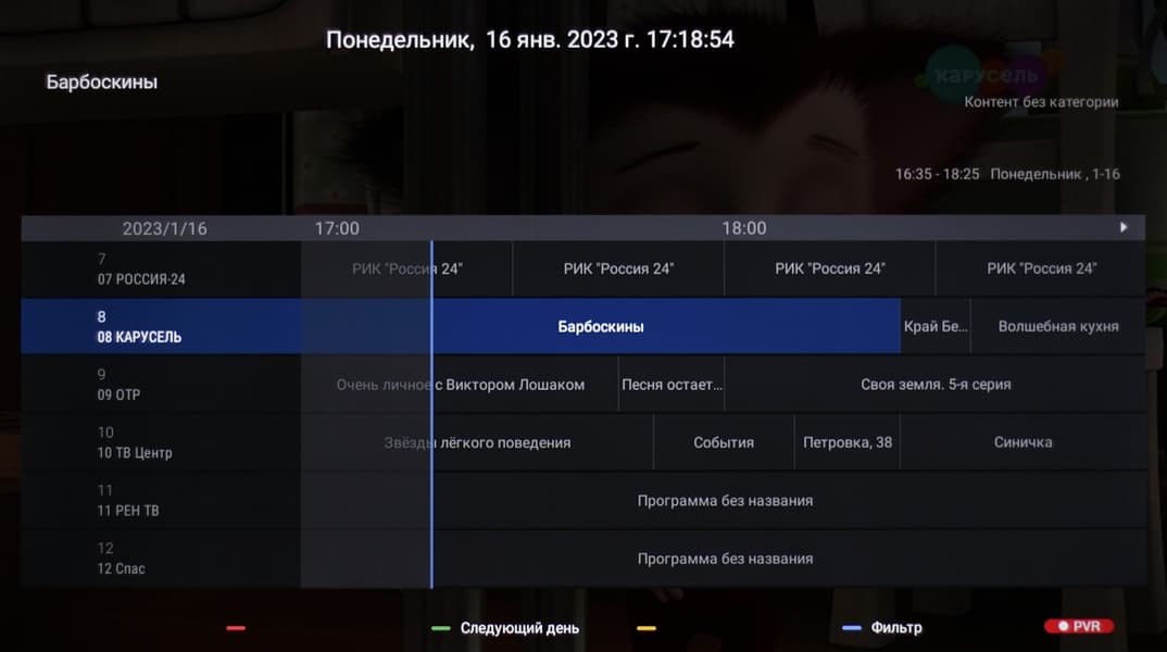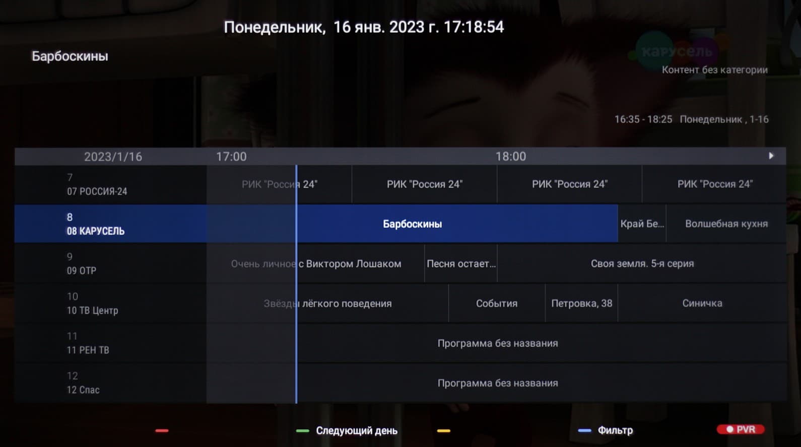 Присутствуют четыре списка избранных программ. Есть хорошая поддержка электронной программы передач (если она передается) — можно посмотреть, что именно идет/будет идти на текущем и других каналах, и запрограммировать запись программы или сериала.