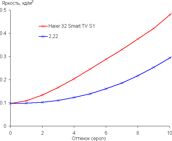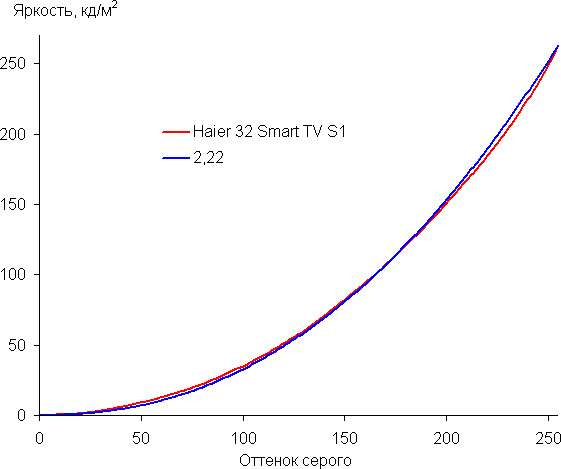 Аппроксимация полученной гамма-кривой дала показатель 2,22, что близко к стандартному значению 2,2. При этом реальная гамма-кривая заметно отклоняется от аппроксимирующей степенной функции: