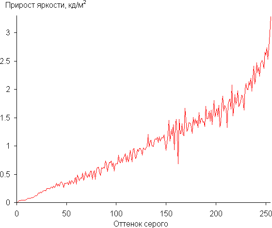 Реальная гамма-кривая ближе к стандартной в случае варианта Средняя, поэтому далее мы измерили яркость 256 оттенков серого (от 0, 0, 0 до 255, 255, 255) при этом значении и при Контрастность = 48. График ниже показывает прирост (не абсолютное значение!) яркости между соседними полутонами: