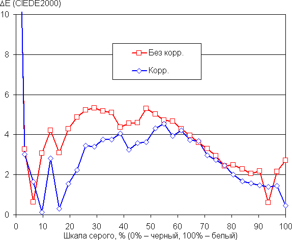 Самый близкий к черному диапазон можно не учитывать, так как в нем цветопередача не так важна, а погрешность измерения цветовых характеристик высокая. Цветовая температура в профиле с максимальной яркостью высоковата, но после ручной коррекции цветовая температура уже близка к стандартным 6500 К, а ΔE также снизилось, при этом оба параметра мало изменяется от оттенка к оттенку на значимой части шкалы серого, что положительно сказывается на визуальной оценке цветового баланса. Впрочем, с практической точки зрения заниматься коррекцией особого смысла нет, так как максимальная яркость после коррекции понижается (до 190 кд/м²). Вполне можно оставить вариант по умолчанию, благо в нем вариация цветовой температуры и ΔE невелика, а это в данном случае важнее, чем их абсолютные значения.