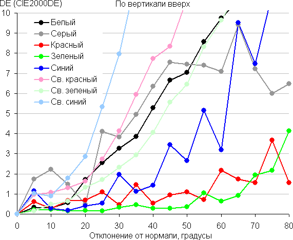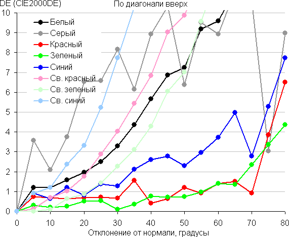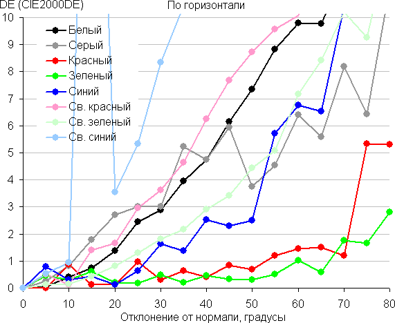 Для количественной характеристики изменения цветопередачи мы провели колориметрические измерения для белого, серого (127, 127, 127), красного, зеленого и синего, а также светло-красного, светло-зеленого и светло-синего полей во весь экран с использованием установки, подобной той, что применялась в предыдущем тесте. Измерения проводились в диапазоне углов от 0° (датчик направлен перпендикулярно к экрану) до 80° с шагом в 5°. Полученные значения интенсивностей были пересчитаны в отклонение ΔE относительно замера каждого поля при перпендикулярном положении датчика относительно экрана. Результаты представлены ниже: