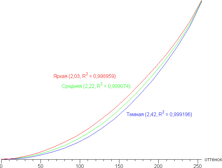 Для оценки характера роста яркости на шкале серого мы измерили яркость 17 оттенков серого при различных значениях параметра Гамма. На графике ниже приведены полученные гамма-кривые (значения показателей аппроксимирующей функции приведены в скобках в подписях, там же — коэффициент детерминации):