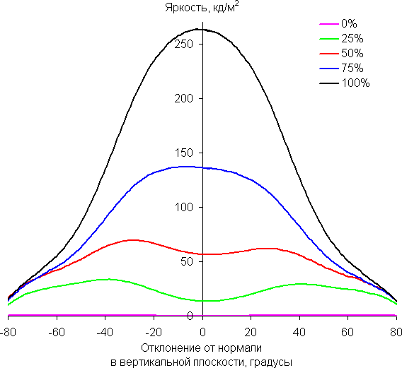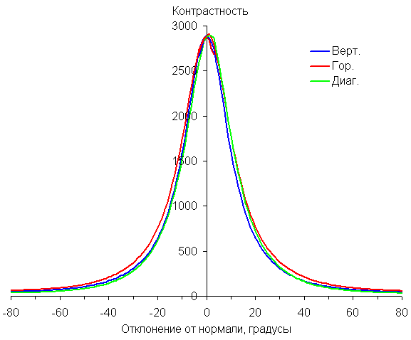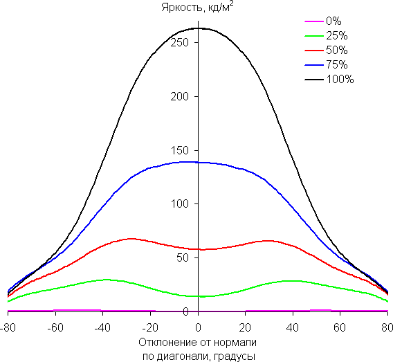 По скорости снижения яркости углы обзора относительно широкие. Яркость черного поля при отклонении от перпендикуляра к экрану возрастает, но всего до примерно 0,4% от максимальной яркости белого поля и только при большом отклонении. Это хороший результат. Контрастность в диапазоне углов ±82° для двух направлений значительно превышает 10:1. Для диагонального направления контрастность при отклонении снижается быстрее, но все равно не опускается за эту отметку.