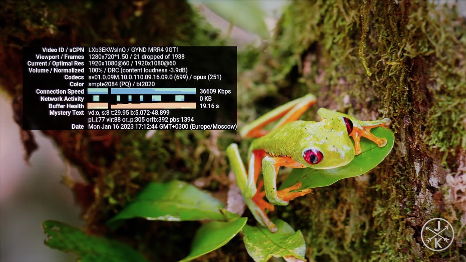 Тестовые ролики на определение равномерности чередования кадров помогли выявить, что телевизор при воспроизведении видеофайлов подстраивает частоту обновления экрана под частоту кадров в видеофайле, но только на 50 или 60 Гц, поэтому файлы с 24 кадр/с воспроизводятся с чередованием длительности кадров 2:3. В стандартном для видео диапазоне (16—235) отображаются все градации оттенков (при Яркость = 50 и Контрастность = 49). Максимальный битрейт видеофайлов, при котором еще не было артефактов, при воспроизведении с USB-носителей и по Wi-Fi составил как минимум 110 Мбит/с (H.264, http://jell.yfish.us/, это максимальный битрейт файлов Full HD в этом наборе), по проводной сети Ethernet — 90 Мбит/с. В двух последних случаях использовался медиасервер роутера Asus RT-AC68U.
