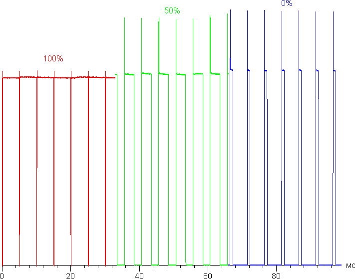 Управление яркостью свечения подсветки осуществляется с помощью ШИМ с частотой 200 Гц. Ниже приведена зависимость яркости от времени, числа — это значения настройки Подсветка: