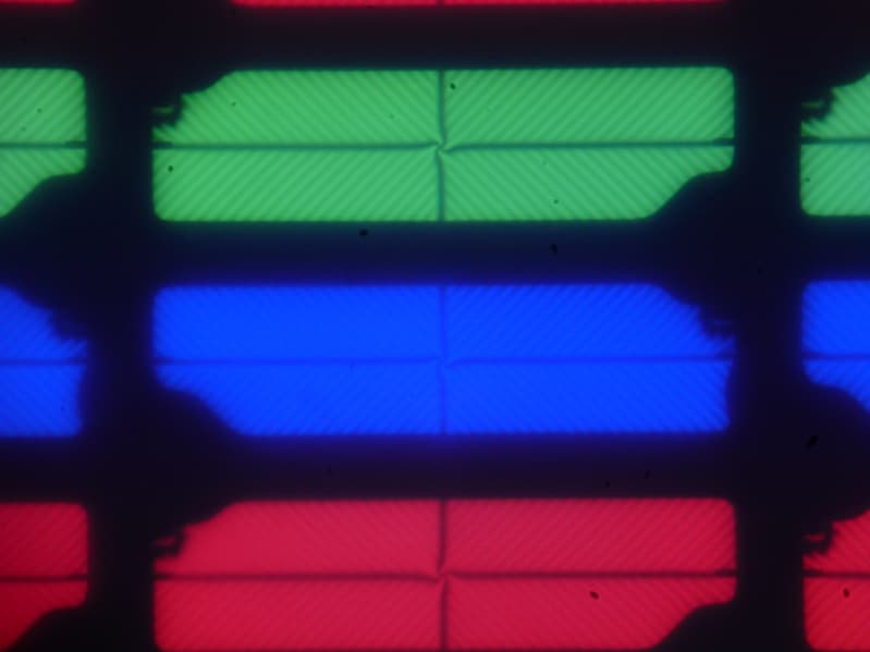 Субпиксели трех цветов (красного, зеленого и синего) разделены на четыре участка с доменами в различающейся ориентации. Такое сложное устройство в принципе способно обеспечить хорошие углы обзора, чему способствует вариация ориентации ЖК в доменах. Отметим, что никакого видимого «кристаллического эффекта» (микроскопической вариации яркости и оттенка) в данном случае нет. Также обратим внимание на горизонтальную ориентацию субпикселей (обычно она вертикальная). Это приводит к тому, что, по крайней мере, субъективно шрифты с попиксельной прорисовкой без сглаживания кажутся более четкими.