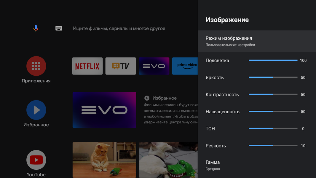 Также настройки и изображения в частности доступны в программах, так как за вызов настроек самого телевизора и настроек программ отвечают две разные кнопки на пульте ДУ. Меню с настройками занимает большую часть экрана, что в ряде случаев затрудняет оценку вносимых в изображение изменений. Настройки изображения сохраняются раздельно как минимум для всех приложений и для каждого из внешних входов, включая ТВ-тюнер, раздельно. Интерфейс переведен на русский язык, качество перевода хорошее. Отметим, что в целом ни к стабильности работы, ни к отзывчивости оболочки у нас особых претензий не возникло.