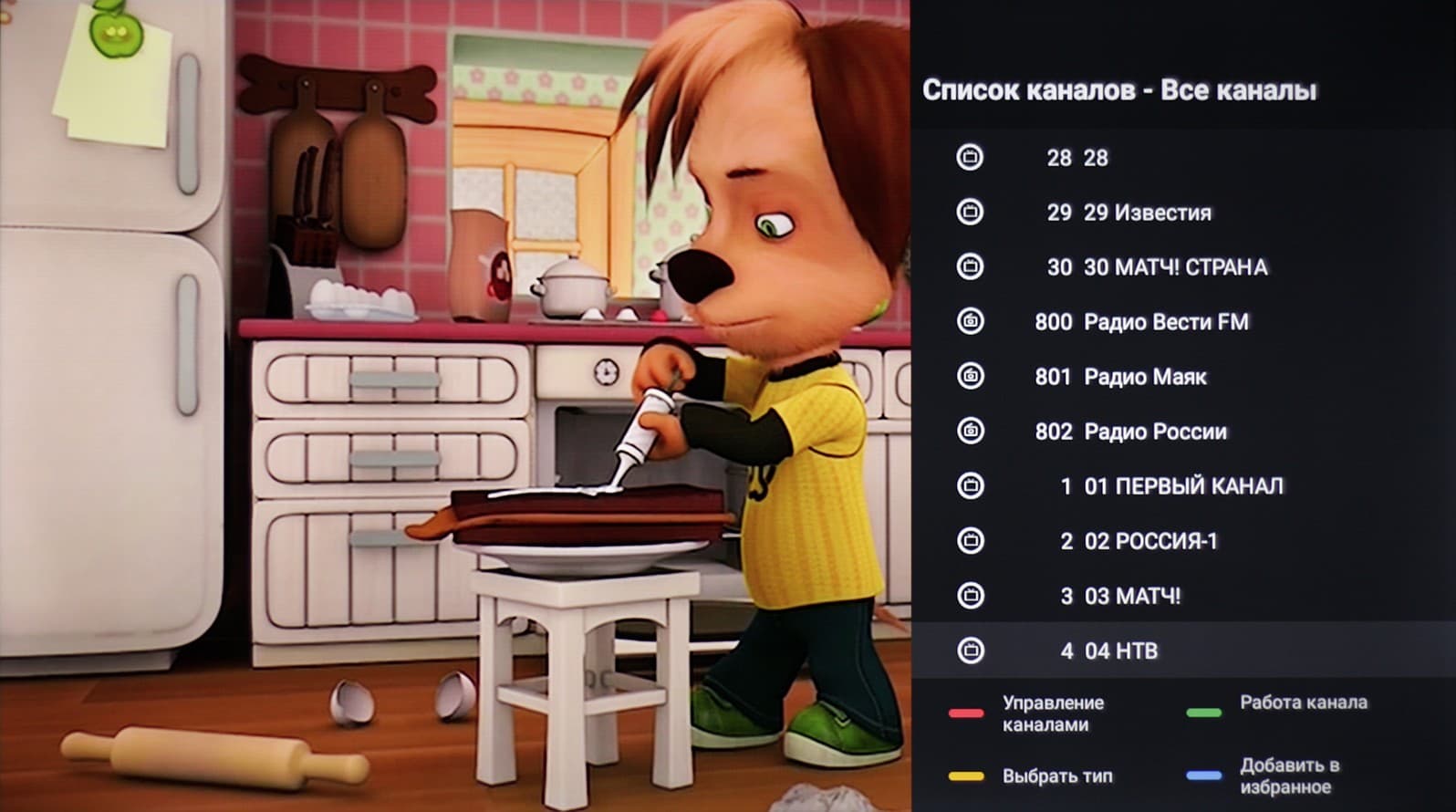 Есть даже список эфирных ТВ-каналов в виде плиток с «живым» просмотром выбранного канала и с названием текущей программы на других.