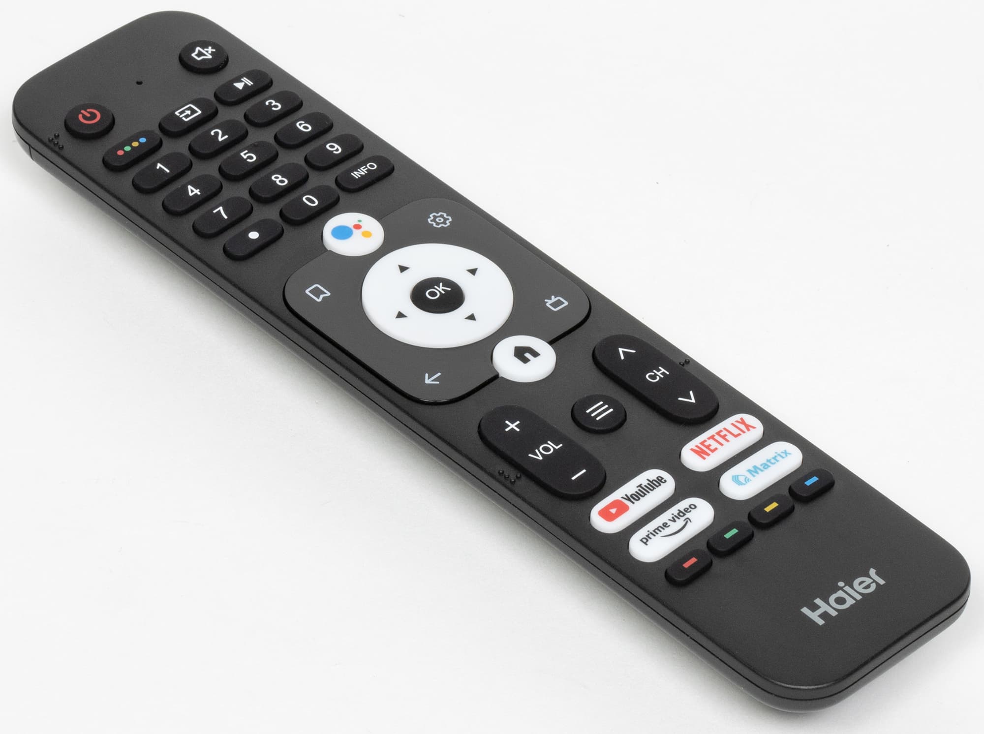 Пульт имеет средние размеры (19×4,4×2,0 см) и вес (94 г с элементами питания). Корпус пульта изготовлен из черного пластика с матовой поверхностью. Кнопки изготовлены из резиноподобного материала, исключение — большая четырехпозиционная кнопка, окружающая кольцо курсорных кнопок, которая изготовлена из жесткого пластика с глянцевой поверхностью. Обозначения кнопок достаточно контрастные и крупные. На пульте есть кнопки для быстрого запуска ряда приложений, которые по сути только занимают место и иногда отнимают у пользователя время из-за случайного запуска (или попытки запуска в случае Netflix) программы. Пульт гибридный, он может работать как по ИК, так и по Bluetooth. Индикатор в передней части пульта мигает красным в первом случае и зеленым — во втором. По ИК пульт работает до сопряжения с телевизором или тогда, когда телевизор находится в глубоком сне. Во всех остальных случаях ИК-передатчик не работает, и команды передаются по Bluetooth. Отверстие, сквозь которое светится индикатор, видимо, является и отверстием микрофона. Голосовой помощник от Google запускается при нажатии на кнопку с цветастыми кружками (для ввода голосовой команды держать ее не нужно), также его можно запустить с домашней страницы. Этот помощник поможет найти контент, который предоставляют ряд программ, и ответить на какие-то вопросы (показывает и проговаривает ответ), например, какая сейчас погода за окном.