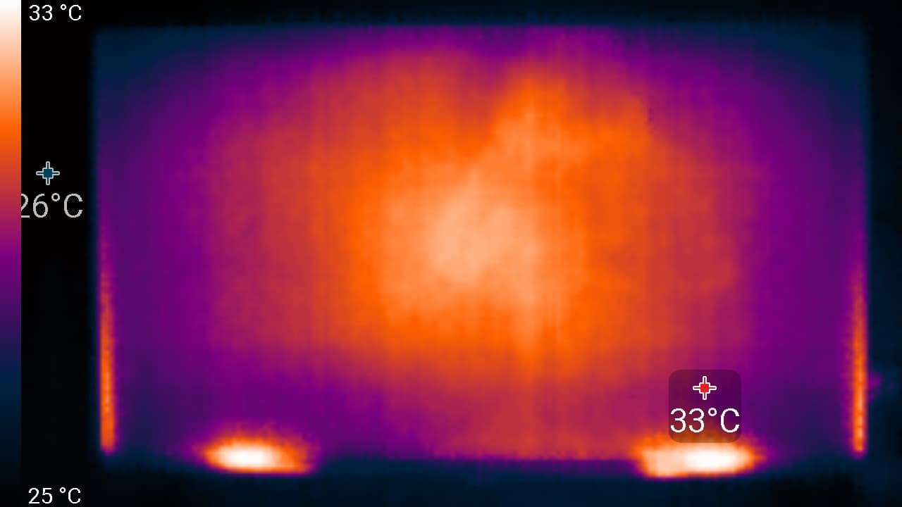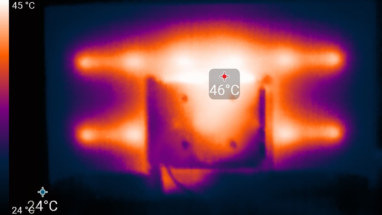 Нагрев телевизора можно оценить по приведенному снимку с ИК-камеры, полученному после долговременной работы на максимальной яркости в помещении с температурой примерно 24 °C: