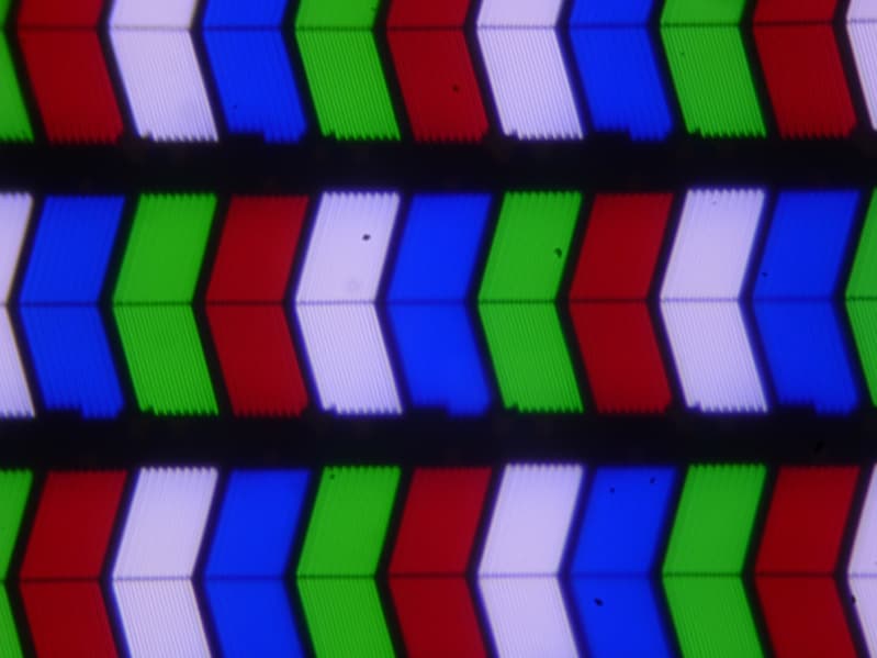 Видно, что из-за белого субпикселя яркость белого поля заметно выше, чем сумма яркости красного, зеленого и синего цветов. Действительно, замеры показали, что так называемая цветовая яркость составляет всего 48% от яркости белого. В результате при большем количестве белого на экране цветные участки выглядят тусклыми. Впрочем, в большинстве случаев при просмотре реальных изображений (то есть кино-/видеосъемки и фотографий) этот эффект выражен очень слабо, просто общая яркость ниже.