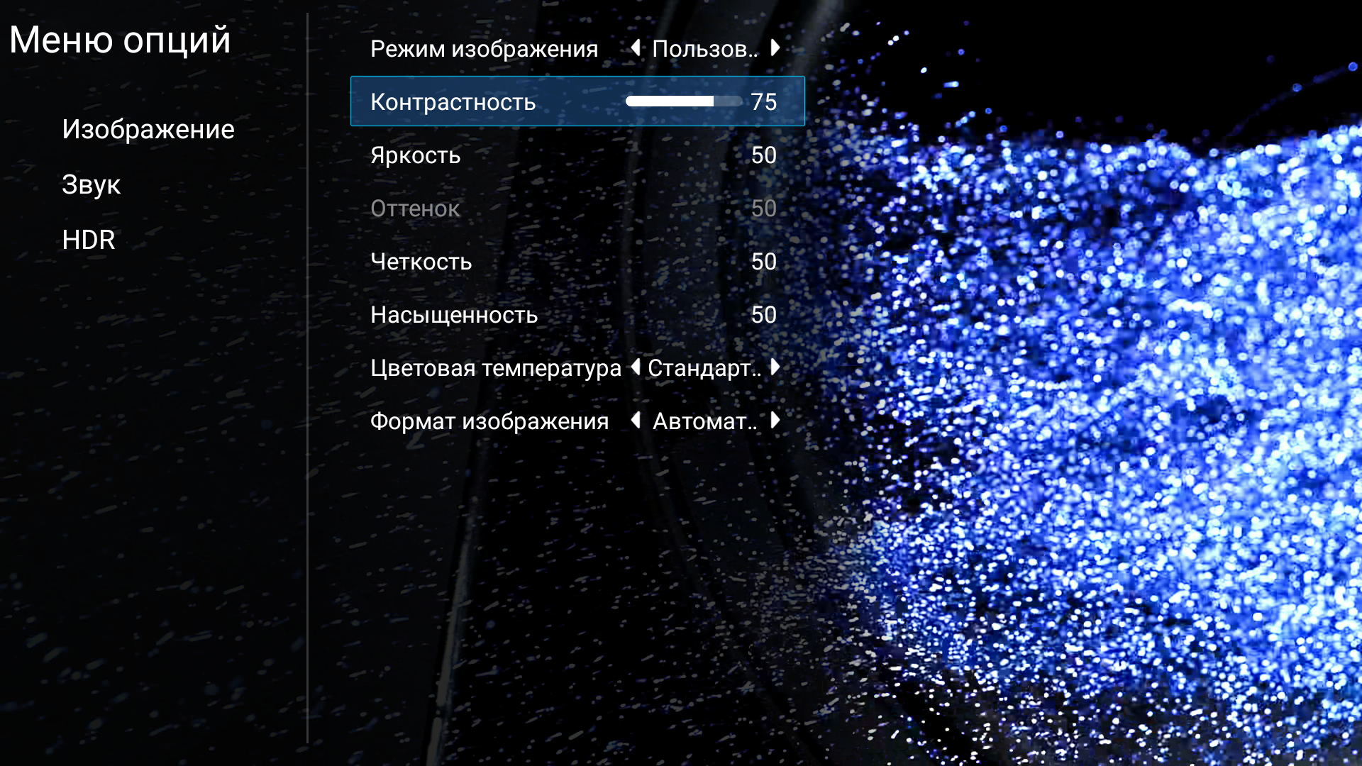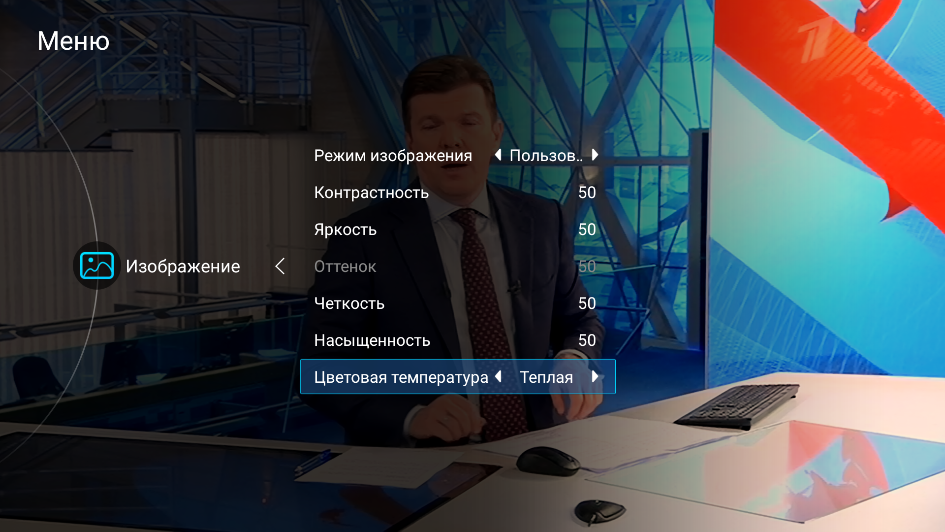 В сторонних программах меню с настройками изображения и звука появляется при нажатии на клавишу F3 на клавиатуре, ее аналога на пульте ДУ мы не нашли.