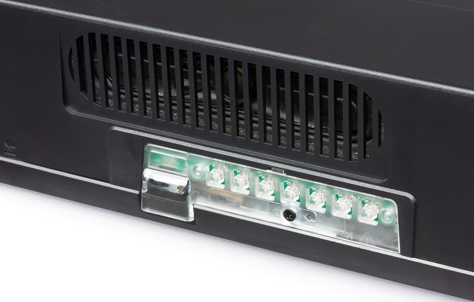 На нижнем торце слева есть накладка из прозрачного пластика. Она прикрывает ИК-приемник пульта ДУ, индикатор состояния и целых 7 кнопок, с помощью которых можно ограниченно управлять телевизором без помощи пульта ДУ.