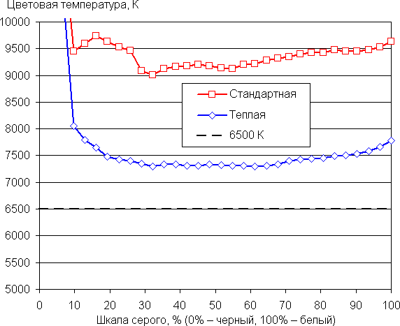 Графики ниже показывают цветовую температуру на различных участках шкалы серого и отклонение от спектра абсолютно черного тела (параметр ΔE) для двух встроенных профилей цветовой температуры:
