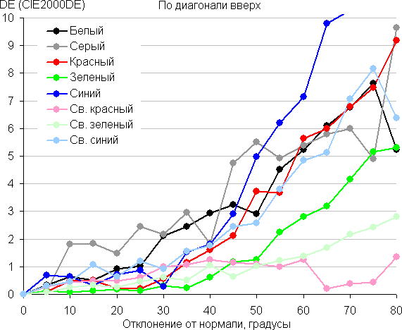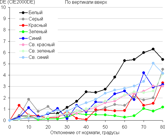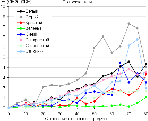 Для количественной характеристики изменения цветопередачи мы провели колориметрические измерения для белого, серого (127, 127, 127), красного, зеленого и синего, а также светло-красного, светло-зеленого и светло-синего полей во весь экран с использованием установки, подобной той, что применялась в предыдущем тесте. Измерения проводились в диапазоне углов от 0° (датчик направлен перпендикулярно к экрану) до 80° с шагом в 5°. Полученные значения интенсивностей были пересчитаны в отклонение ΔE относительно замера каждого поля при перпендикулярном положении датчика относительно экрана. Результаты представлены ниже: