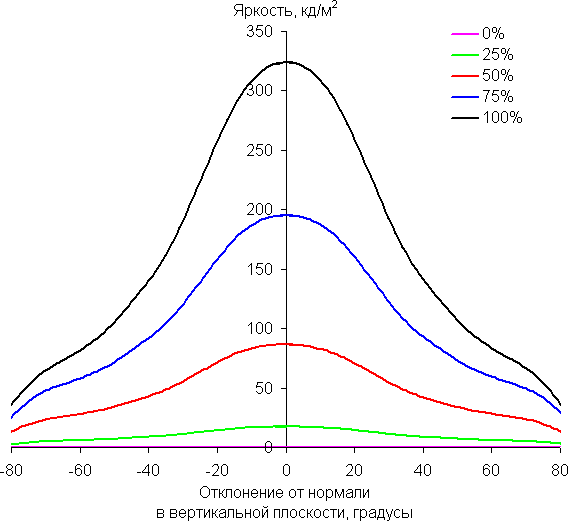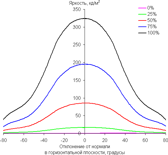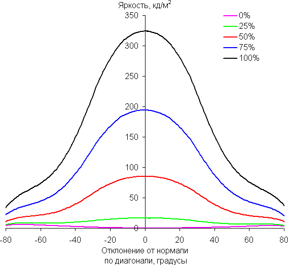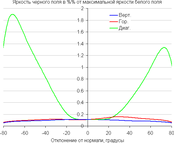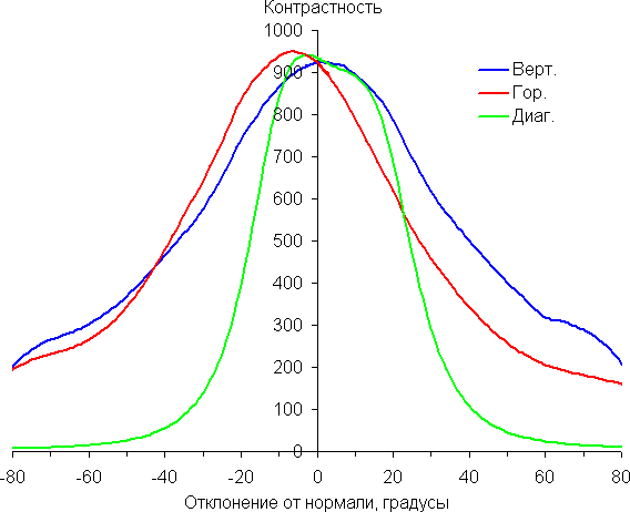 Отметим плавное уменьшение яркости при отклонении от перпендикуляра к экрану во всех трех направлениях, при этом графики яркости полутонов не пересекаются во всем диапазоне измеряемых углов. При отклонении в диагональном направлении поведение яркости оттенков имеет промежуточный характер между вертикальным и горизонтальным направлениями, за исключением яркости черного поля, которая начинает резко возрастать уже при 30° отклонения от перпендикуляра к экрану. Если сидеть от экрана на расстоянии 2 м, то черное поле по углам будет заметно светлее, чем в центре. Контрастность в диапазоне углов ±82° для двух направлений значительно превышает 10:1 и только для диагонального направления она ниже и по одной диагонали опускается за отметку 10:1 при 69°.