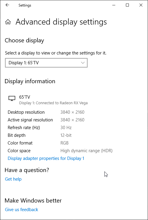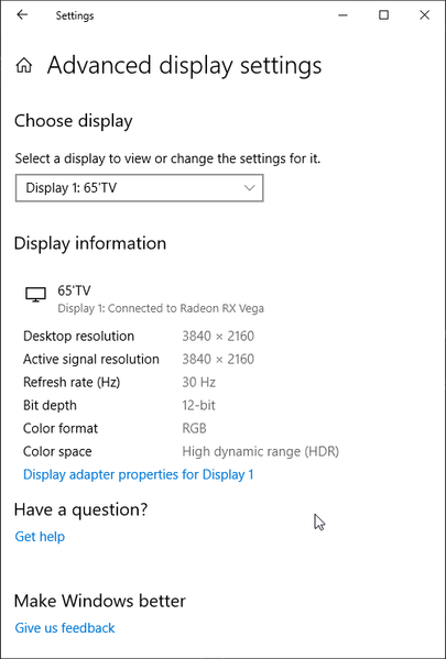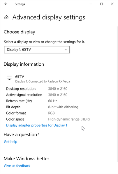 Под Windows 10 вывод в режиме HDR на данный телевизор возможен при выборе соответствующих опций в настройках дисплея. При разрешении 4К и 60 Гц вывод идет в режиме 8 бит на цвет, дополненных динамическим смешением цветов, видимо, с помощью видеокарты на аппаратном уровне. При 30 Гц — 12 бит на цвет:
