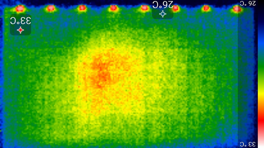 Видно, что основным источником тепла является центральная область экрана и 8 точек внизу под рамкой. По всей видимости, в данном телевизоре используется не краевая, а задняя подсветка с 8 вертикальными линейками светодиодов, не поделенная на независимо управляемые зоны.