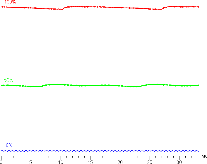 На любом уровне яркости значимая модуляция подсветки отсутствует, поэтому нет и никакого мерцания экрана. В доказательство приведем графики зависимости яркости (вертикальная ось) от времени (горизонтальная ось) при различных значениях настройки Подсветка: