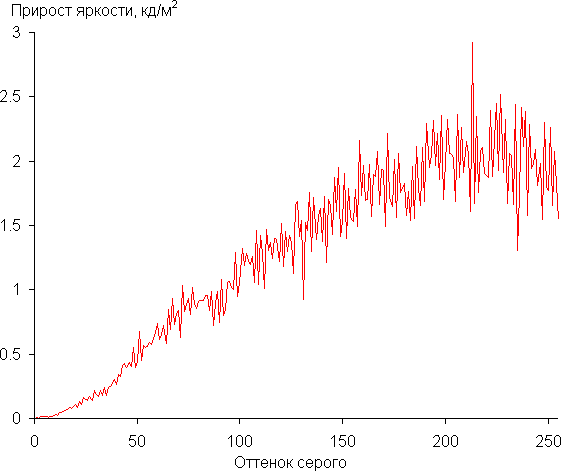 Для оценки характера роста яркости мы измерили яркость 256 оттенков серого (от 0, 0, 0 до 255, 255, 255) при подключении к ПК по HDMI в режиме RGB. График ниже показывает прирост (не абсолютное значение!) яркости между соседними полутонами: