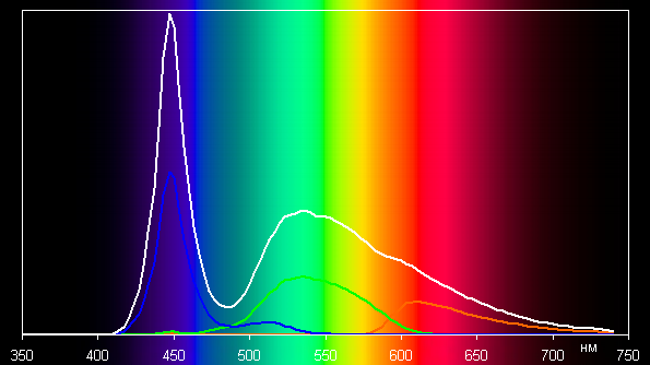 Ниже приведен спектр для белого поля (белая линия), наложенный на спектры красного, зеленого и синего полей (линии соответствующих цветов):