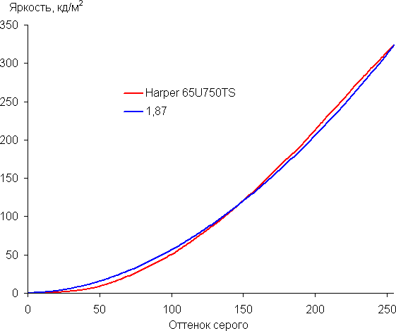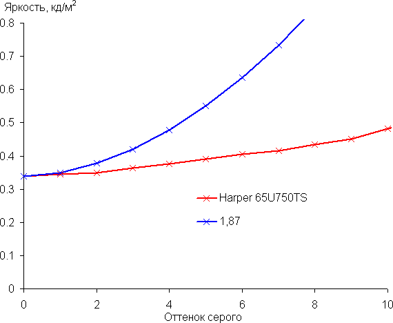 Рост прироста яркости неравномерный, но хотя бы каждый следующий оттенок ярче предыдущего. В самой темной области различаются все градации оттенков: