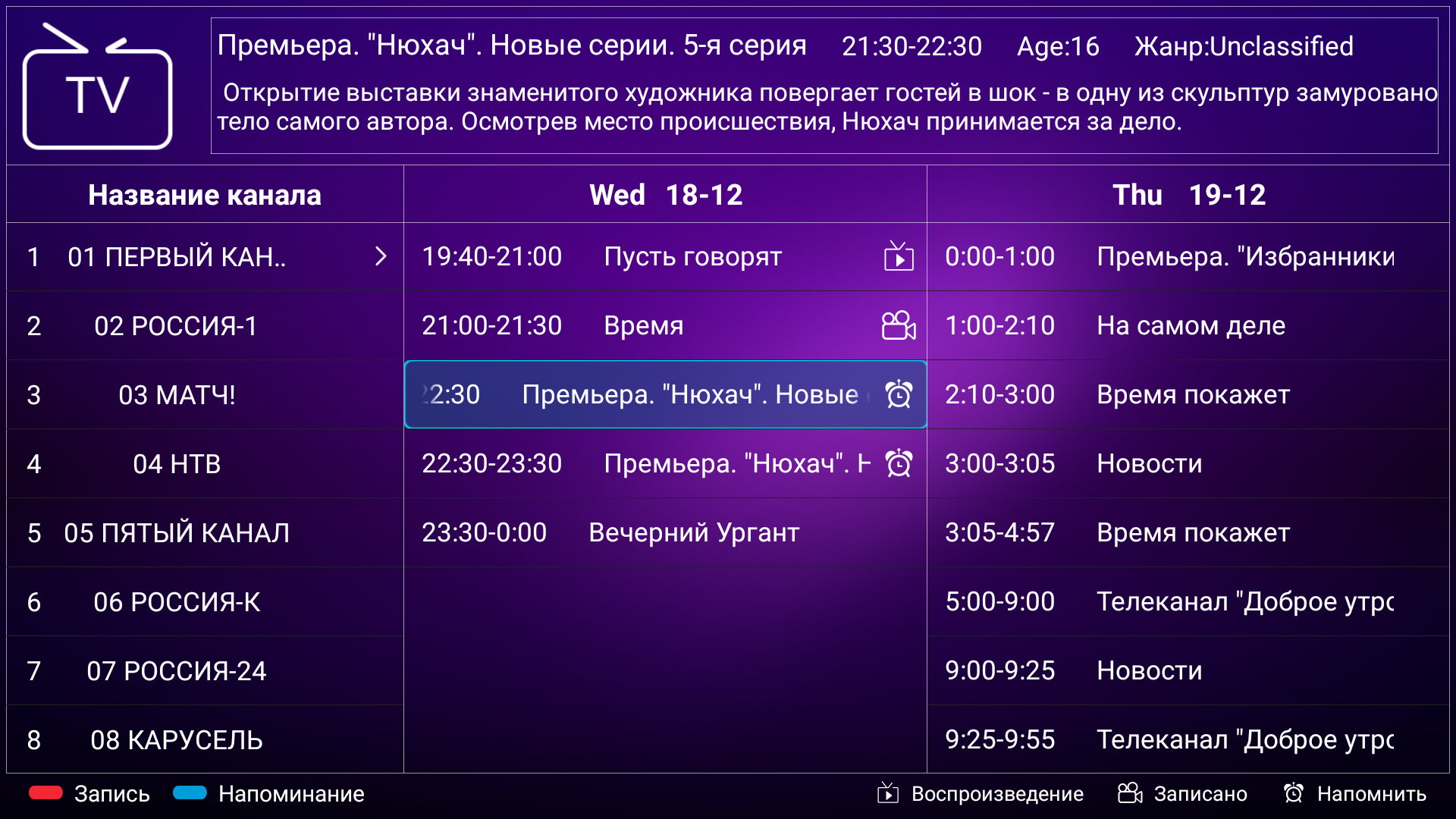 Есть хорошая поддержка электронной программы передач — можно посмотреть, что именно идет на текущем и других каналах, запрограммировать просмотр или запись программы или сериала и т. д.