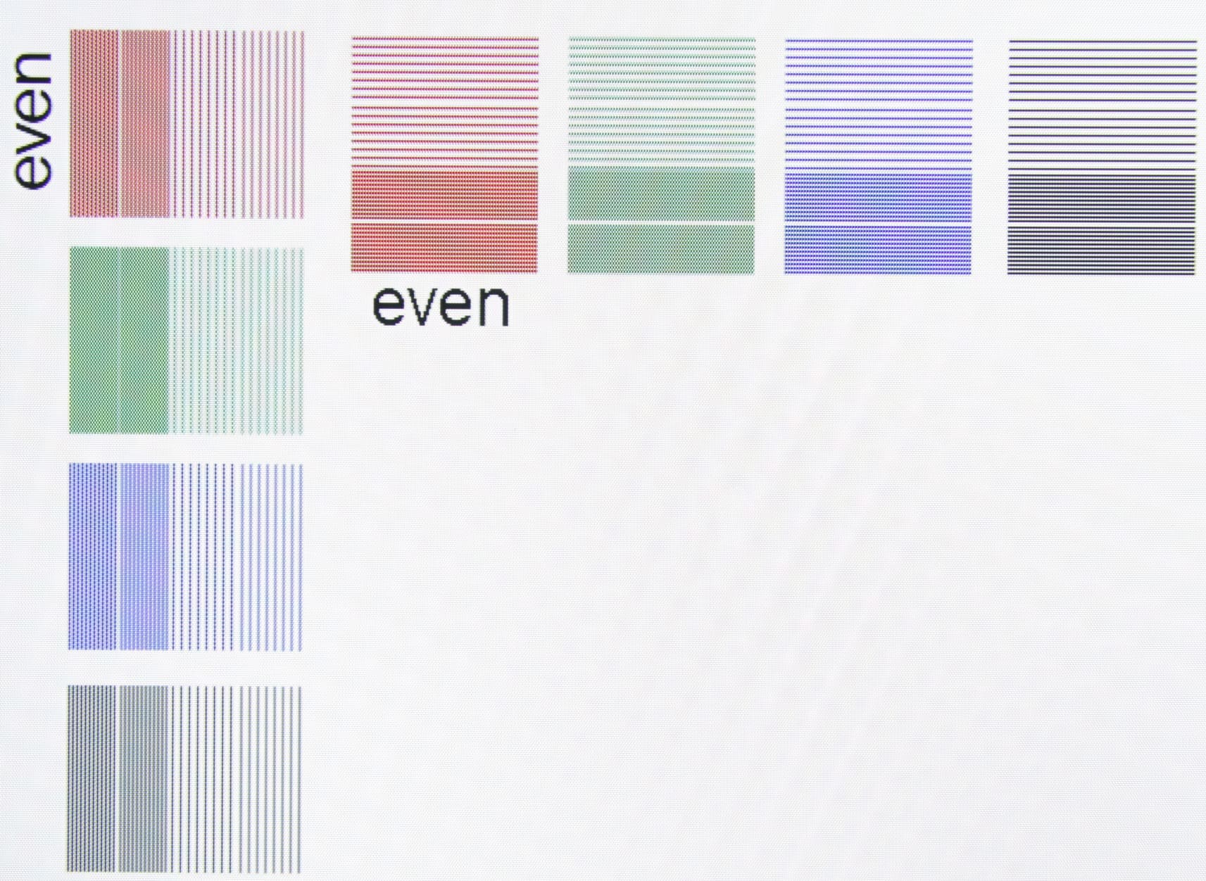 При подключении к компьютеру по HDMI вывод изображения в разрешении 3840 на 2160 пикселей мы получили с кадровой частотой вплоть до 60 Гц включительно. Телевизор все также не подстраивает частоту обновления экрана под частоту кадров в видеосигнале — все выводится в режиме 60 Гц. Масштабирование к разрешению матрицы ТВ (если оно нужно) выполняется с хорошим качеством, контраст тонких линий сохраняется. В случае сигнала 4К с исходной цветовой четкостью (вывод в режиме RGB), вывод собственно изображения на экран ТВ формально осуществляется без снижения цветовой четкости, но из-за особенностей ЖК-матрицы миры с полосками через пиксель «рыхлые». Пример приведен на фотографии экрана ниже (полоски через пиксель и через два пикселя), ее лучше рассматривать в масштабе 1:1 (исходное изображение).