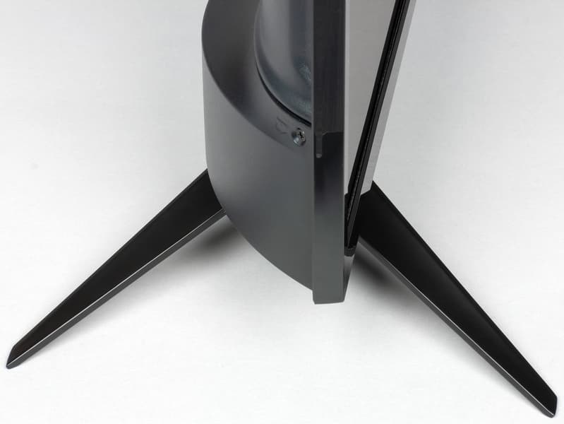 Местоположение кнопок обозначено значками на рамке спереди. В дежурном режиме индикатор не очень ярко горит синим, а в рабочем — не светится. Штатная подставка состоит из двух ножек галочкой, изготовленных из алюминиевого сплава, снаружи они анодированы и имеют черное матовое покрытие.