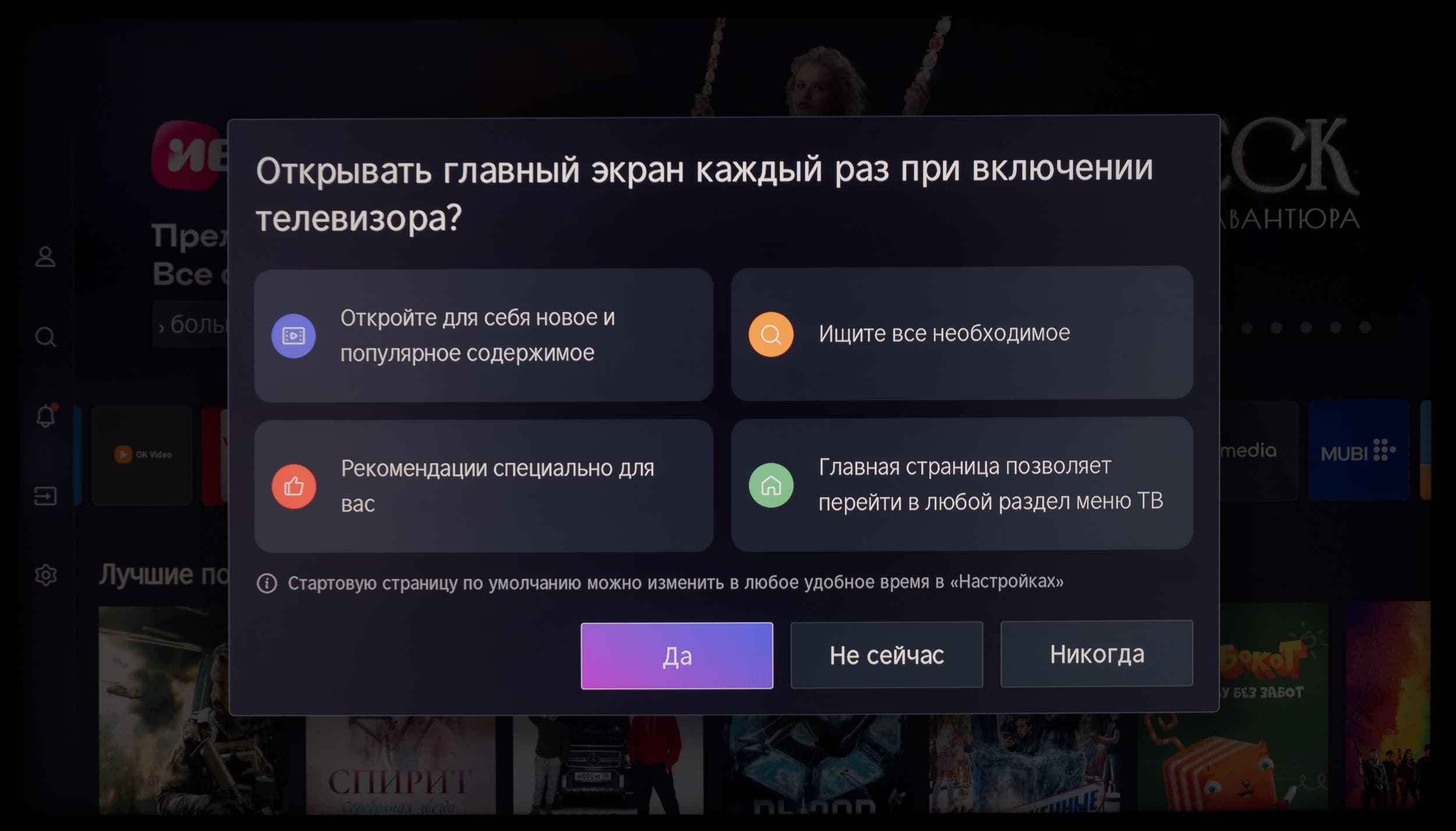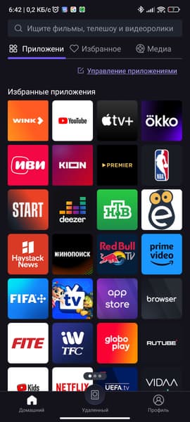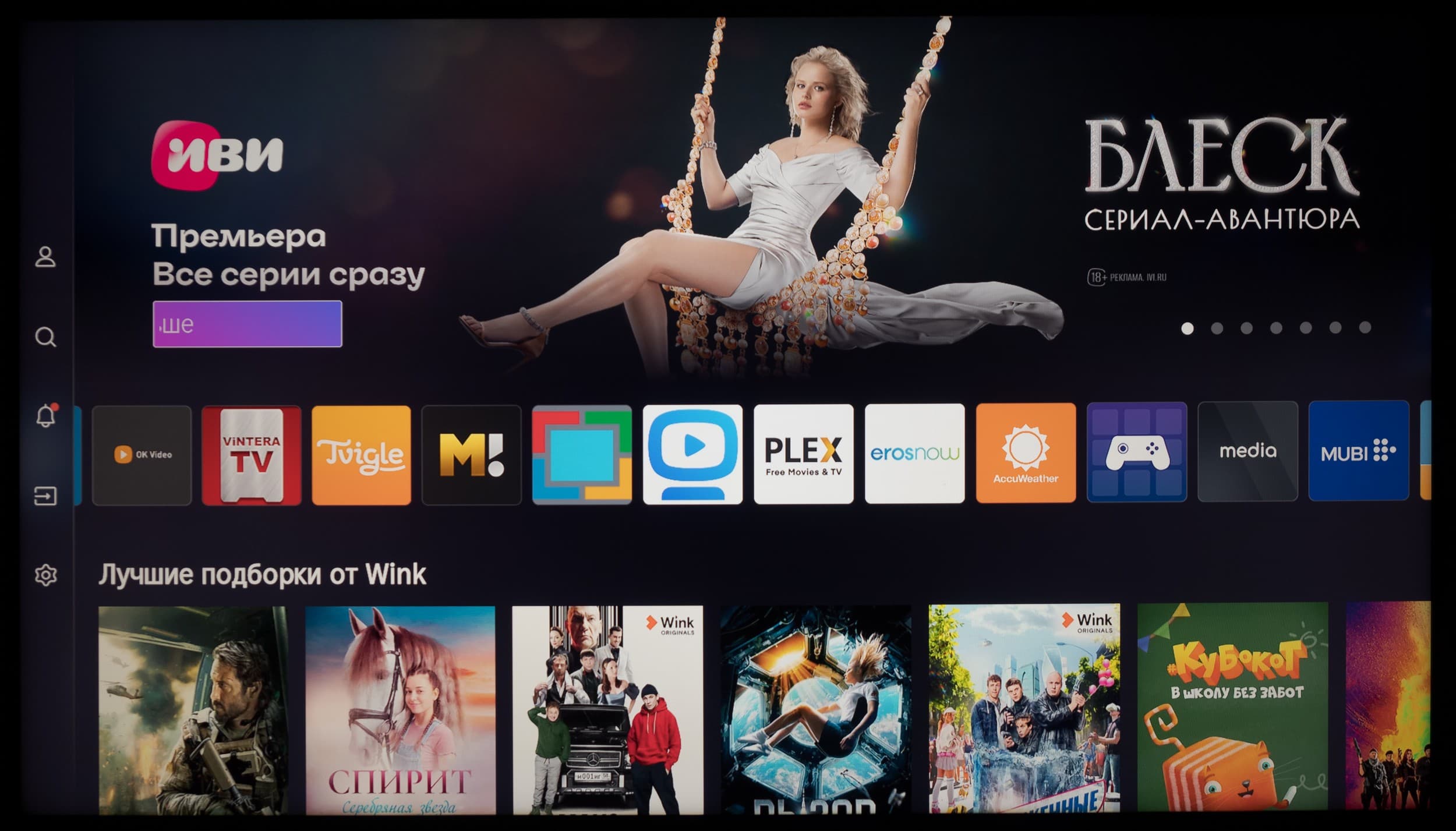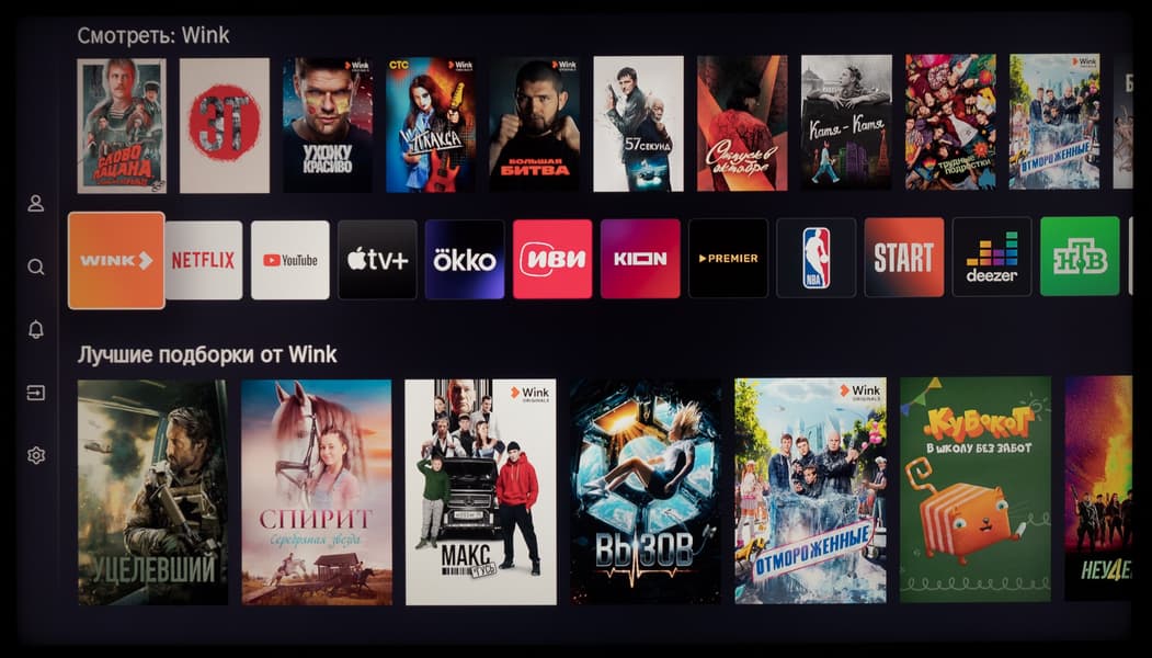 Ниже за лентой избранных приложений идут ленты рекомендованного контента из Okko, ivi, Wink, Кинопоиск, Premier, Kion и других знакомых всем нам сервисов.