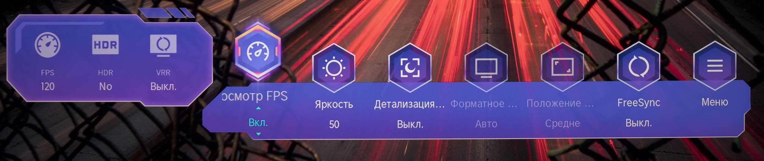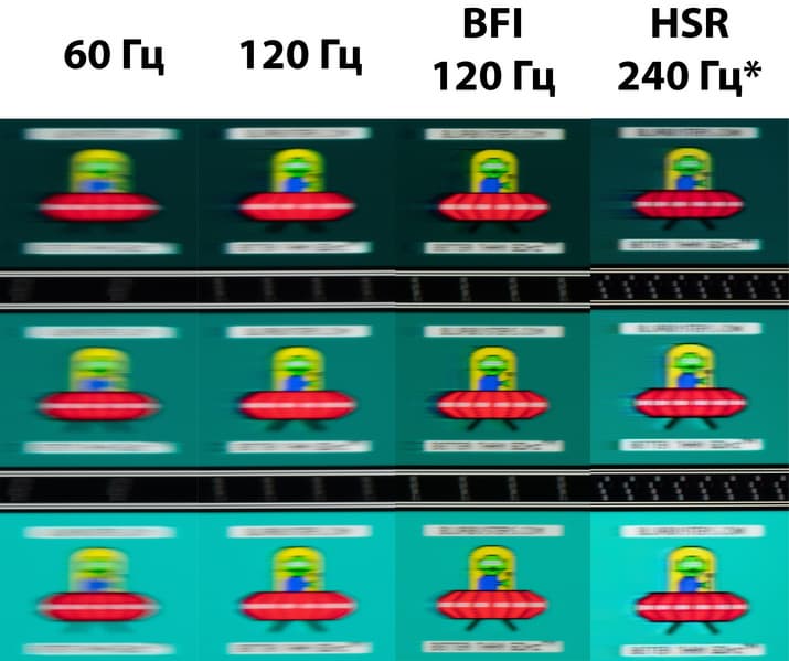 У новинки доступен специальный режим HFR (High Frame Rate) c частотой развертки 240 Гц, но исключительно при снижении рабочего разрешения до стандарта Full HD (1920×1080), при котором падает и четкость изображения вследствие интерполяции. Хорошо видно, что для ускорения матрицы в данном режиме используется не самый корректный Overdrive, что приводит к появлению большого количества артефактов, а вот визуальная скорость растет не так сильно. Пожалуй, стоит остановиться на 120-144 Гц.